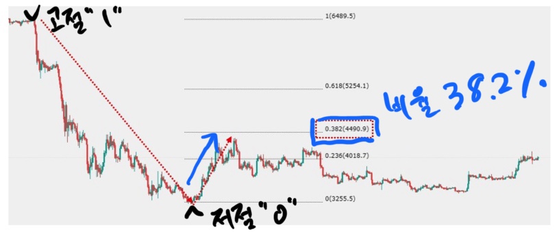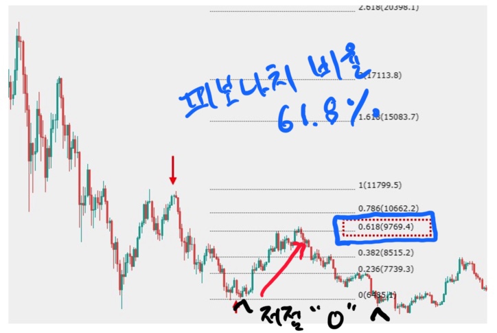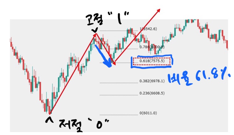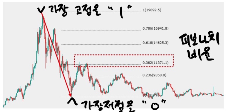 위 이미지 보시면 캔들의 가장 저점을 0으로 보고 가장 고점을 1로 보고 이를 피보나치 배율로 도식화 하면