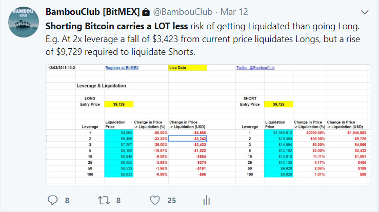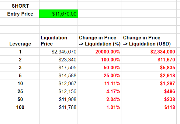 The above tables show that Shorting is safer than going Long, in that a larger percentage change (and USD change) is required to cause Liquidation when you go Short than when you go Long, for a given level of Leverage.