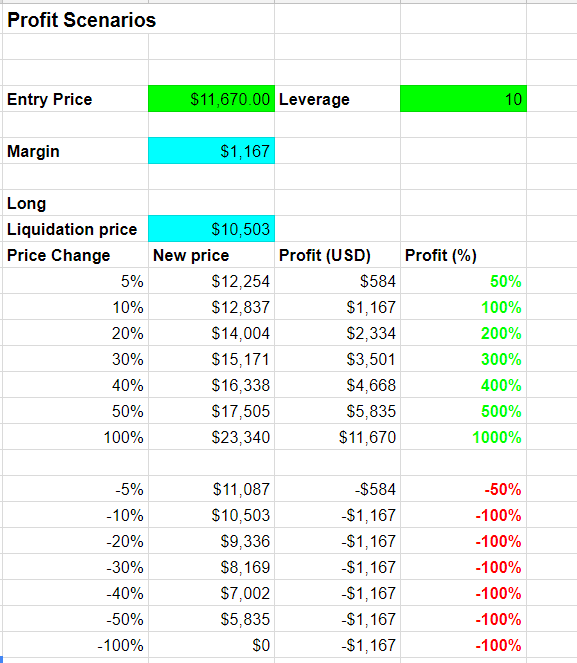This is the maximum you can lose. You lose the entire amount should the price fall by 10% from $11,670 to $10,500. If the price was to crash to $5,000 your loss is still limited to $1,167 which is the value of your Initial Margin.