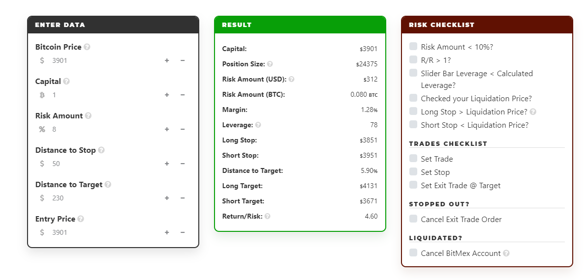 AntiLiquidation.com is configurable so you can input your own risk numbers. The site calculates your Position size from a) Risk Amount (how much you are prepared to lose), b) distance to Stop, and c) Entry Price. A checklist takes you through the structuring of a good trade that avoids all possibility of Liquidation and ‘blowing up’ your account.