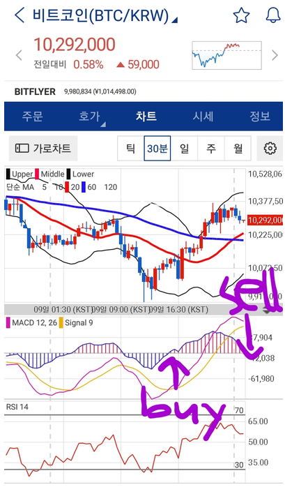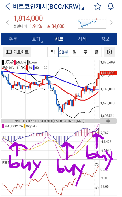 노랑색선이 시그널선 자주색선이 MACD 선입니다.두 선이 교차하는 지점에서 주가를 보시면 자주색선이 노랑색선을 뚫고 상승하는 지점부터 주가가 상승하는 차트입니다.이번엔 반대로 자주색선이 노랑색선을 아래로 뚫고 내리려는 모습으로 그때 주가는 빠지고 있습니다.