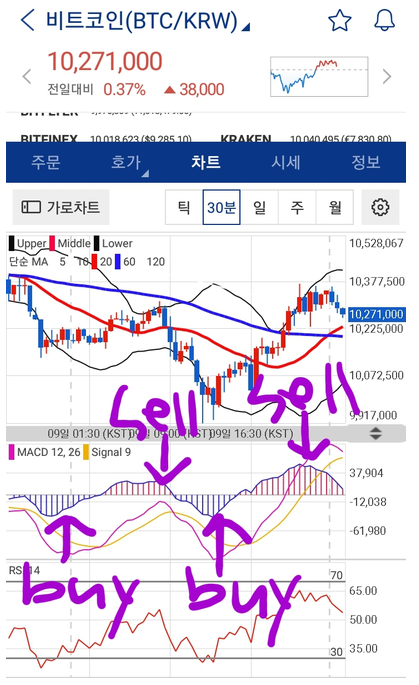 선은 시그널선(signal),MACD선이 있으며,막대바는 오실레이터로 부릅니다.각각 의미하는 바를 설명하기엔 너무 복잡하기에 그냥 MACD를 활용한 매매법으로 바로 넘어갑니다.