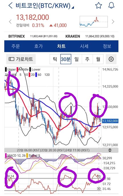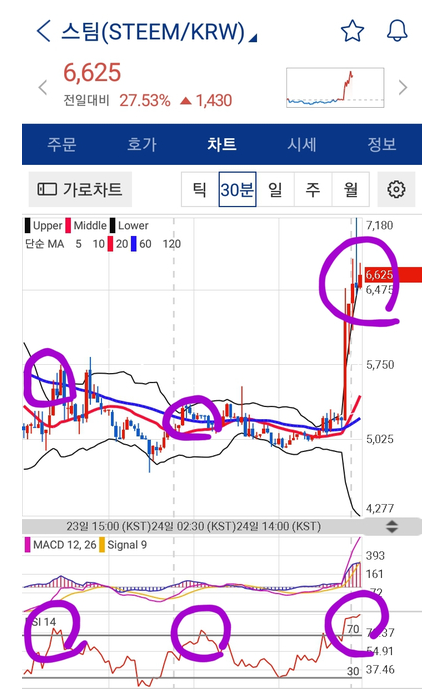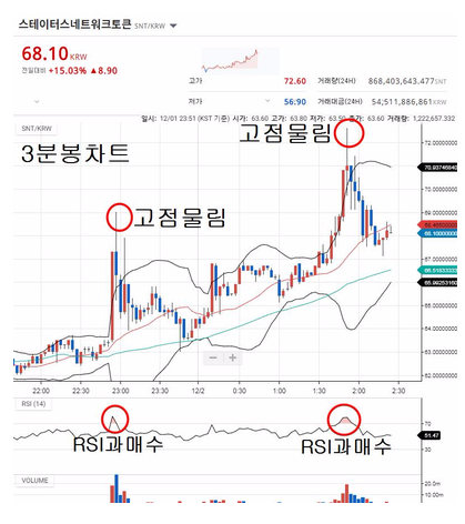 예시보시면,차트가 고점에 물릴경우 아래 RSI 지표를 보면 70이 넘어갑니다.거의 고점이기 때문에 RSI 70 이상되면 매도하는걸 권합니다.