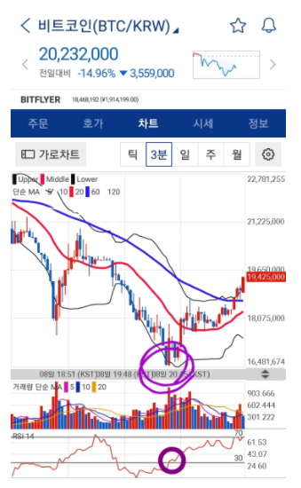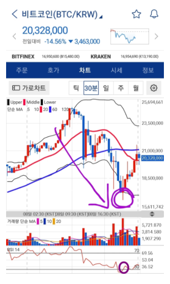 권해드리는 방법은 위 차트와 같이 RSI 30 이하에서 다시 30이상으로 처 올라오는 지점이 매수타이밍으로 좋습니다.